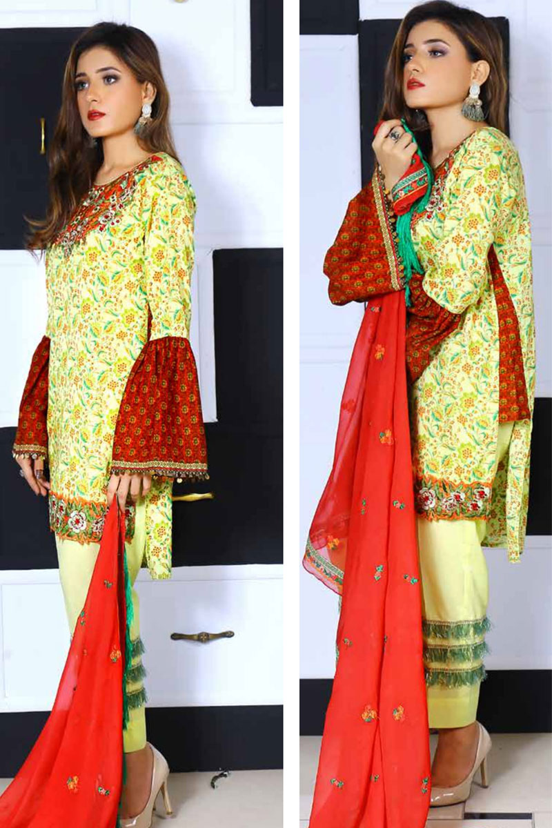 Yellow Occasional Ethnic Wear Embroidered Lawn Cotton Salwar Qamiz With Chiffon Dupatta